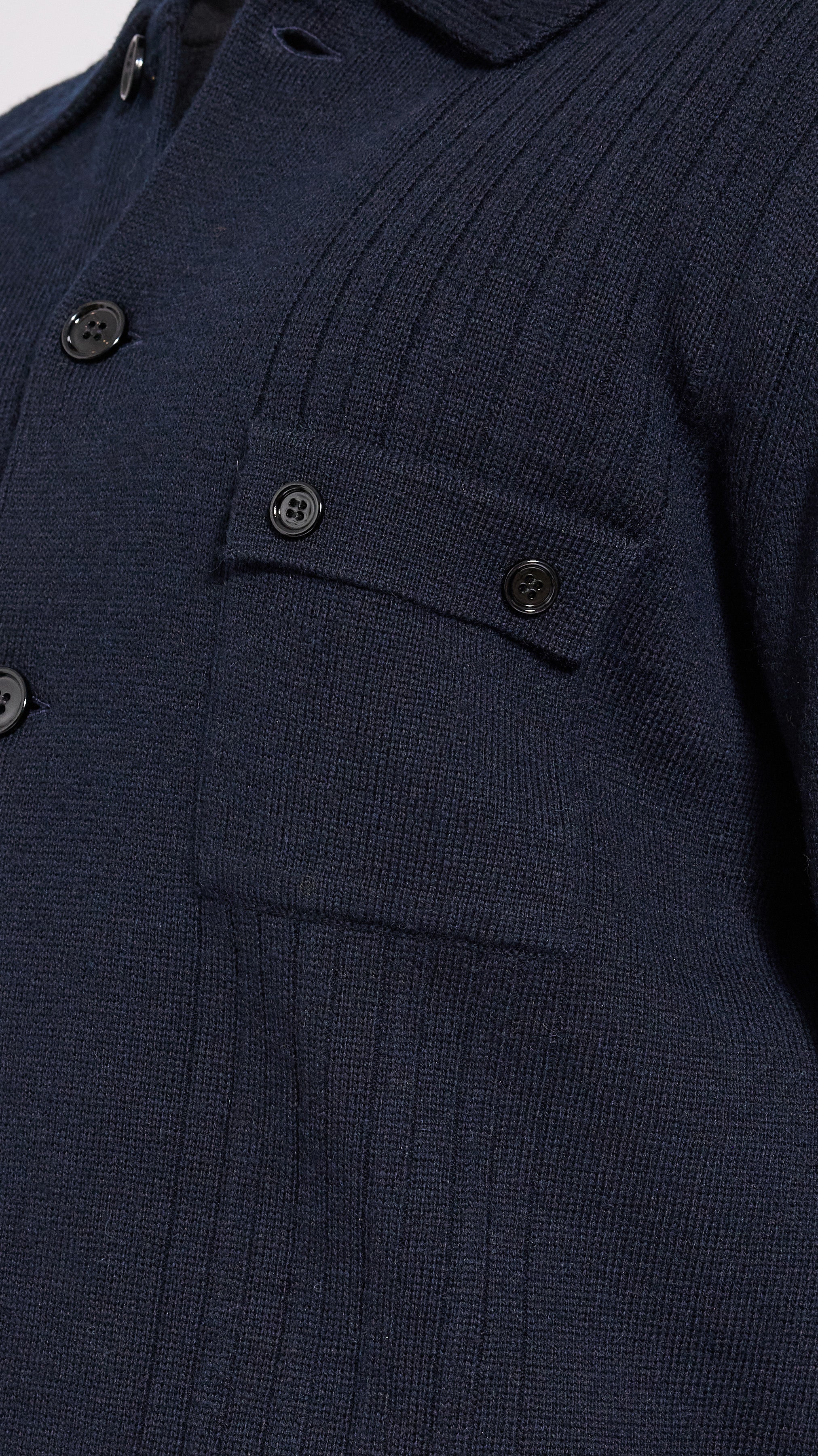 Buttoned cardigan sweater in black. Slim fit. Shirt style collar. Ribbed knit collar, hemline and cuffs. Alternating ribbed knit detail through out. Button pocket on chest.