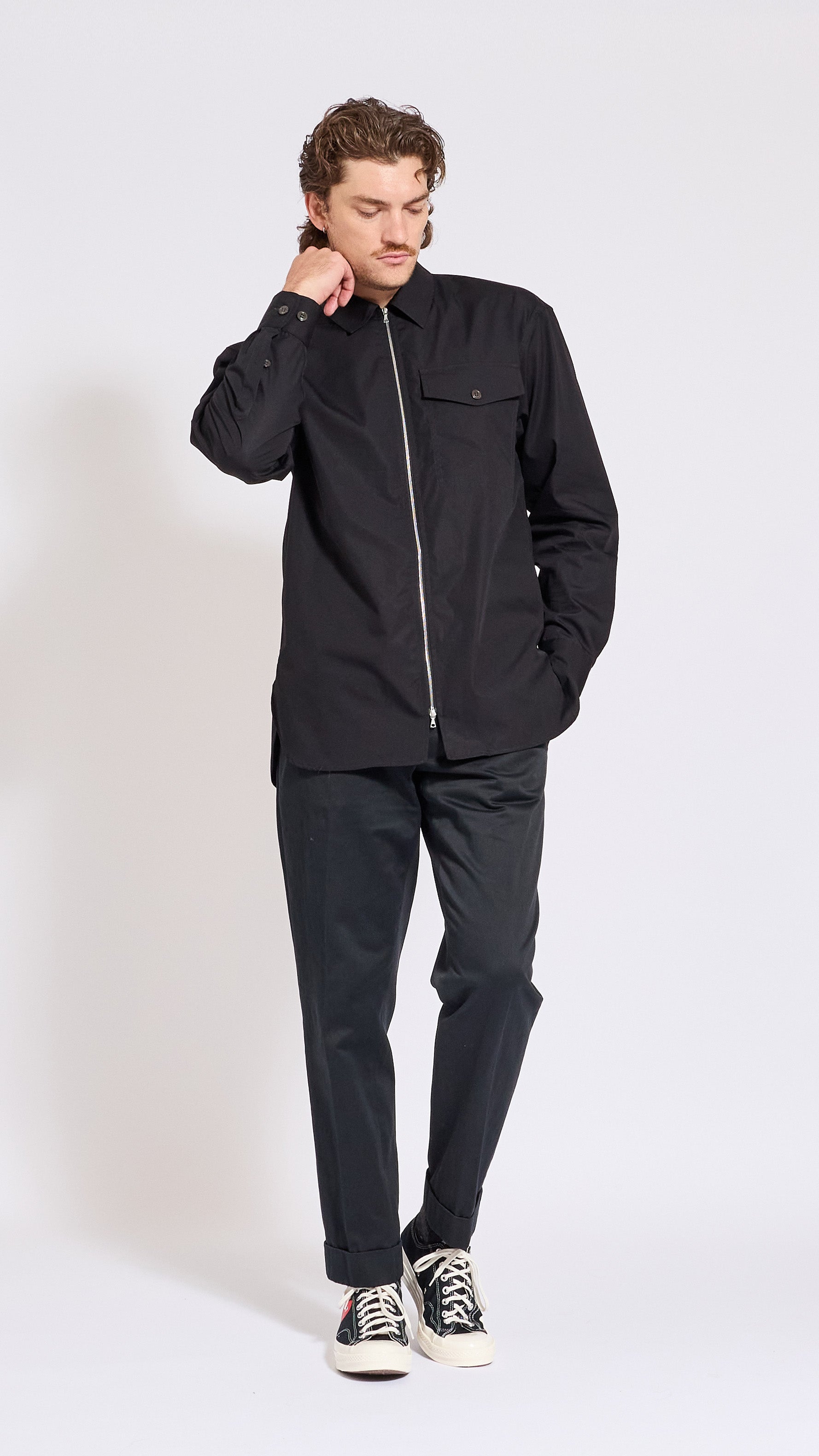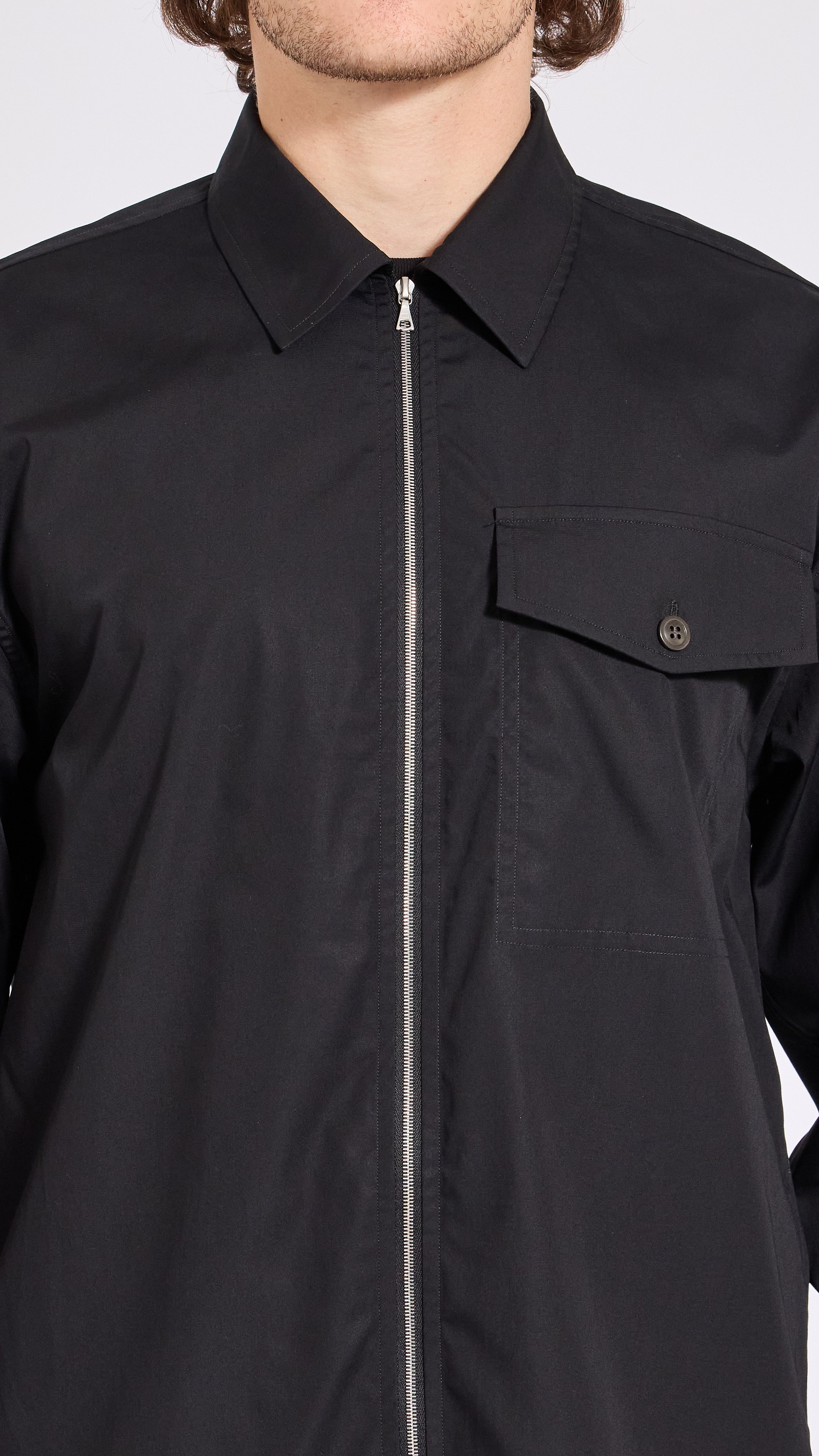 Cotton poplin zip shirt in black. Regular fit. Front zip closure. Double button barrel cuffs. Buttoned front chest pocket. Curved hemline with side slit.