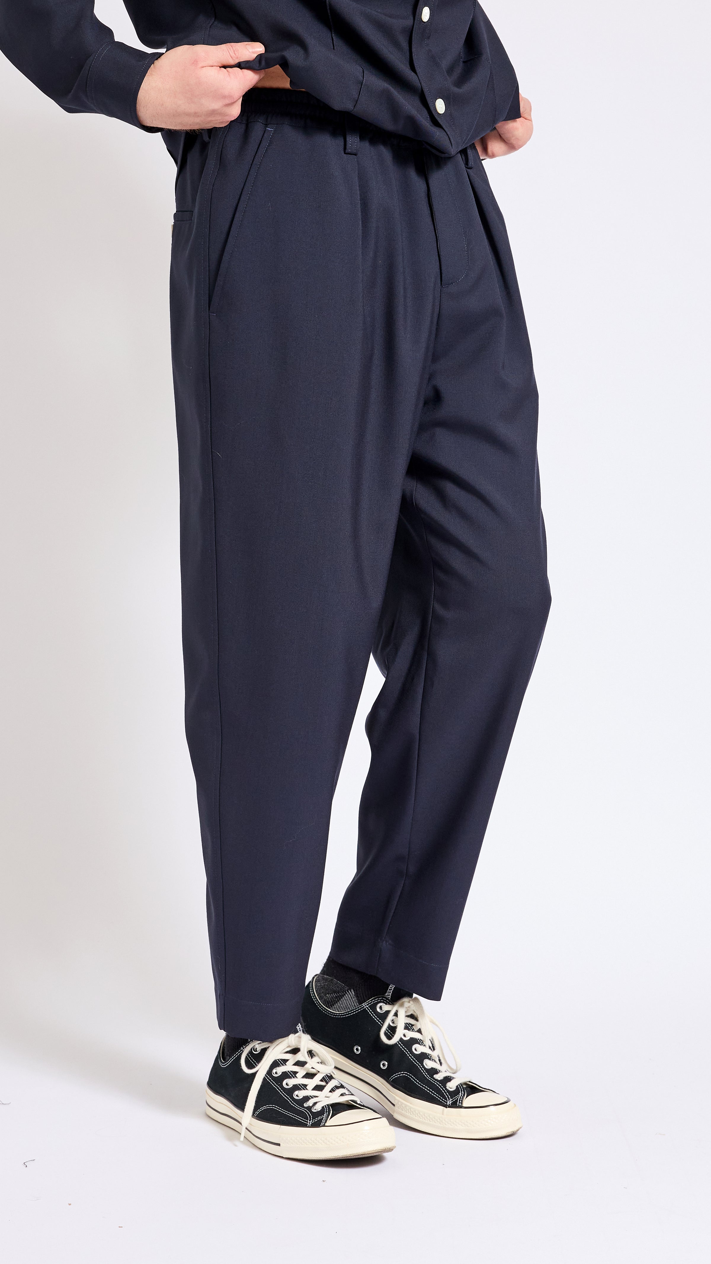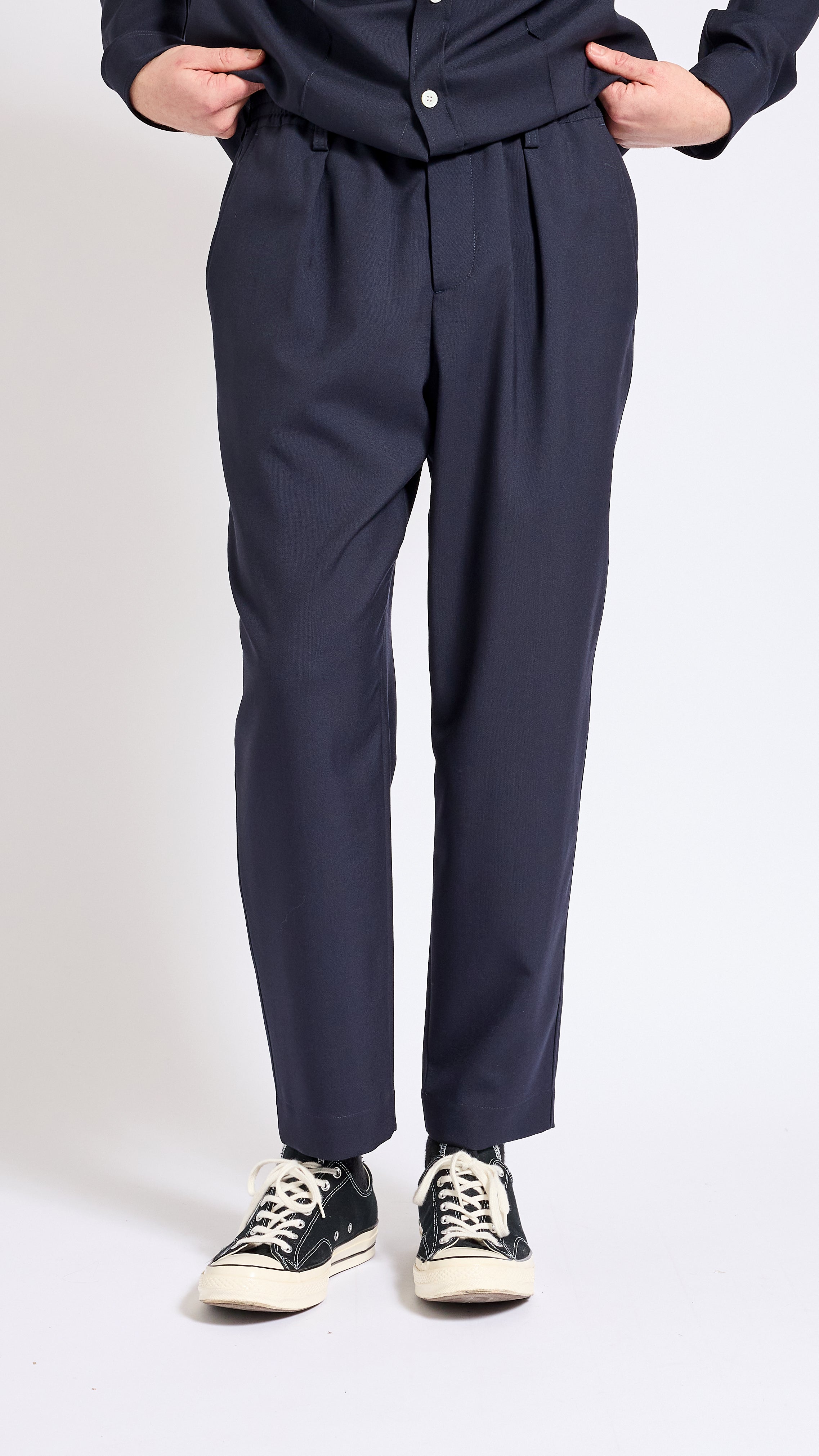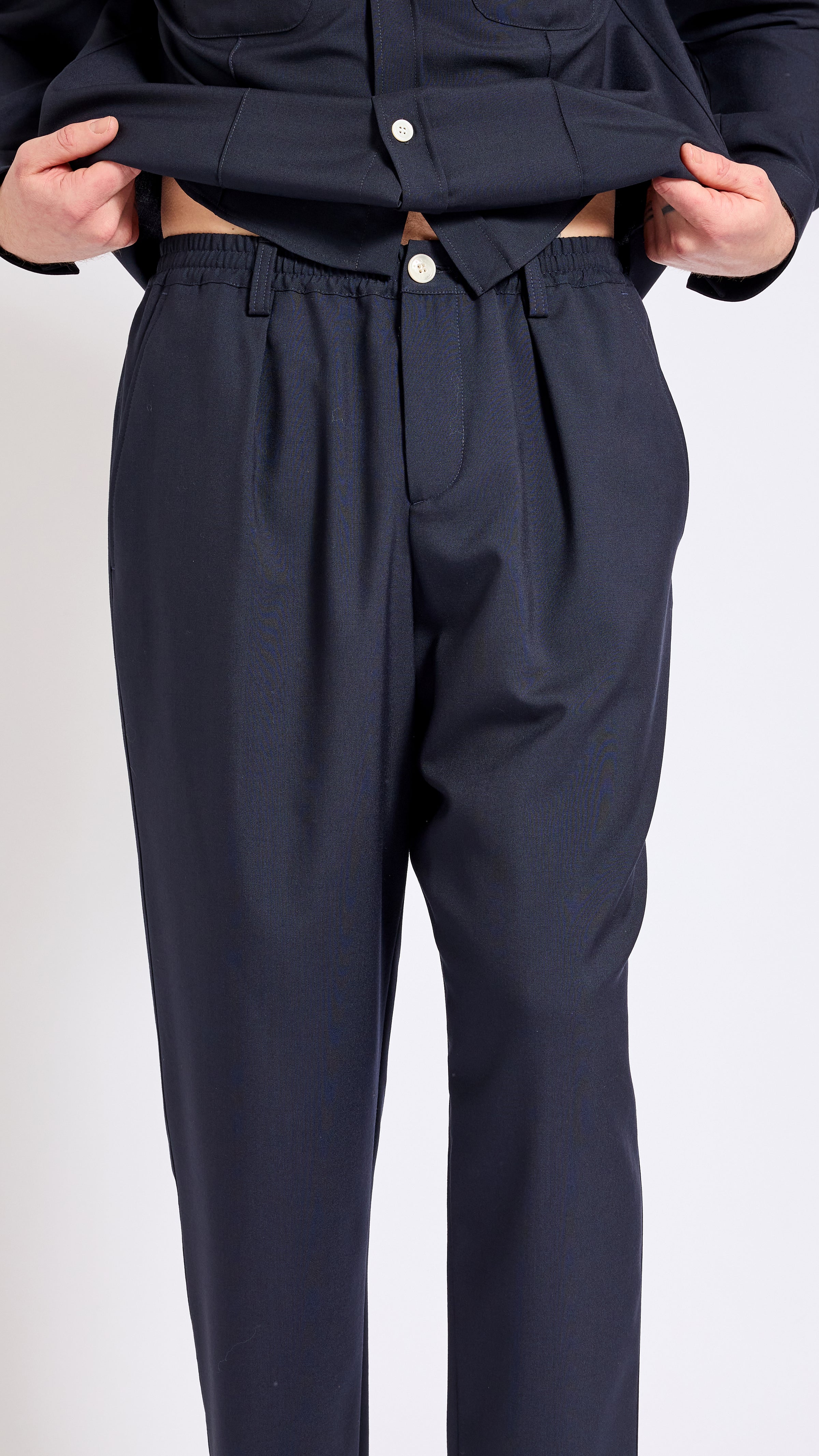 Tropical wool pants in blue/black. Relaxed fit with tapered leg. Elastic waist. Interior drawstring. Two side pockets and two back seem pockets.