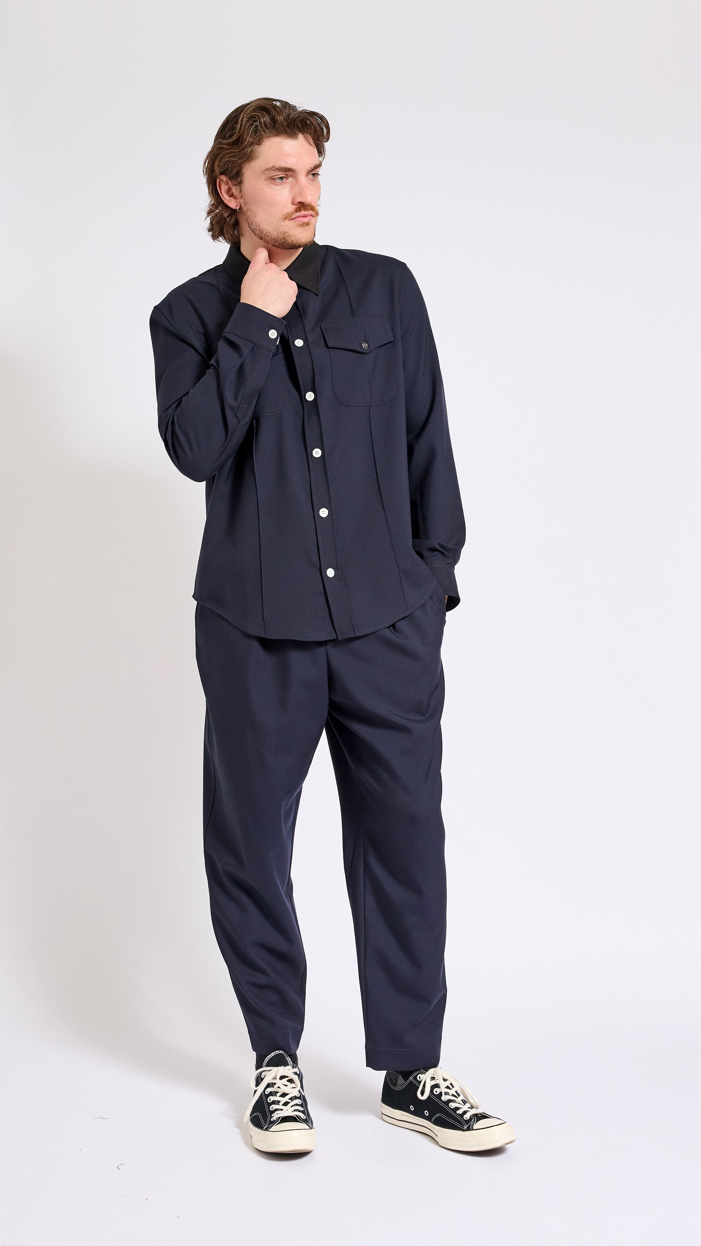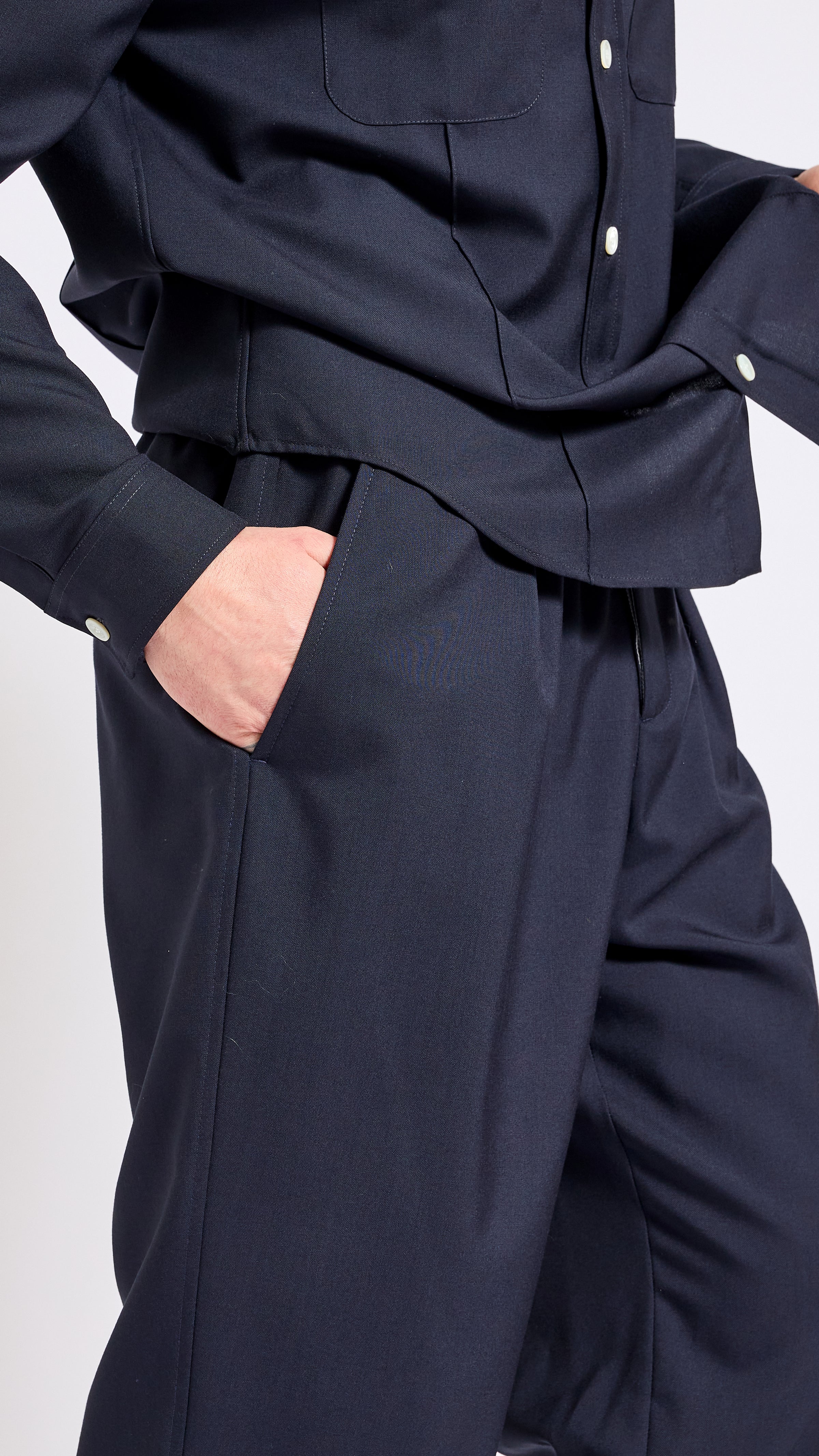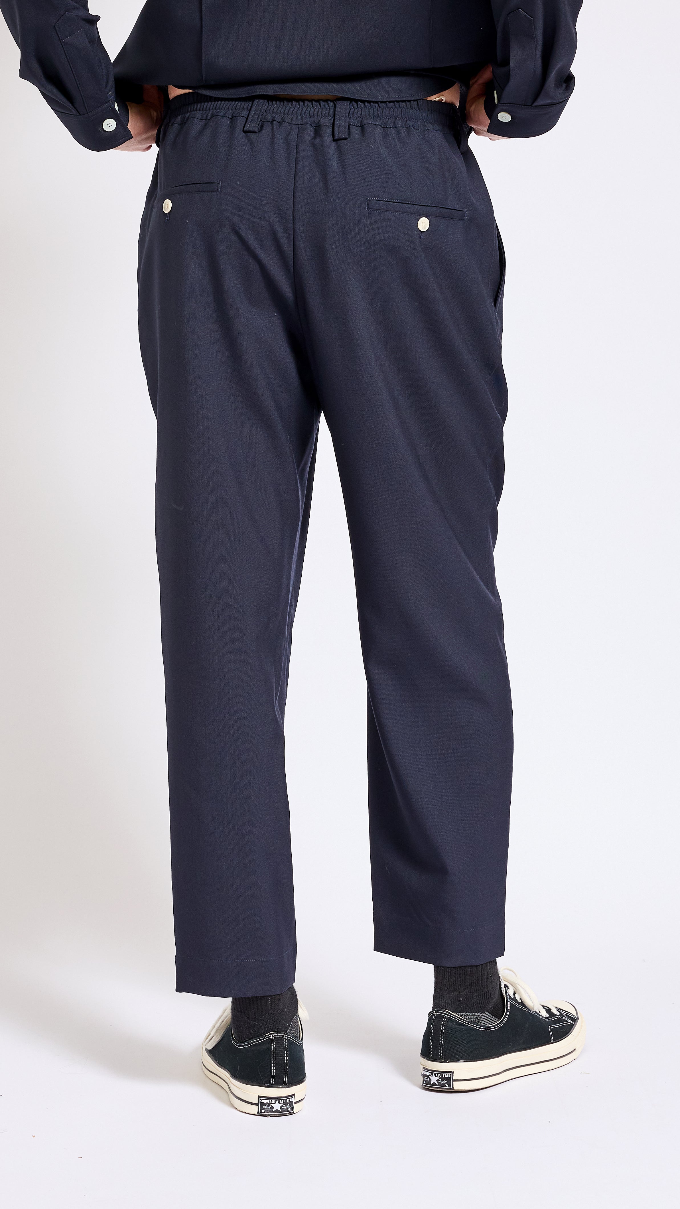 Tropical wool pants in blue/black. Relaxed fit with tapered leg. Elastic waist. Interior drawstring. Two side pockets and two back seem pockets.