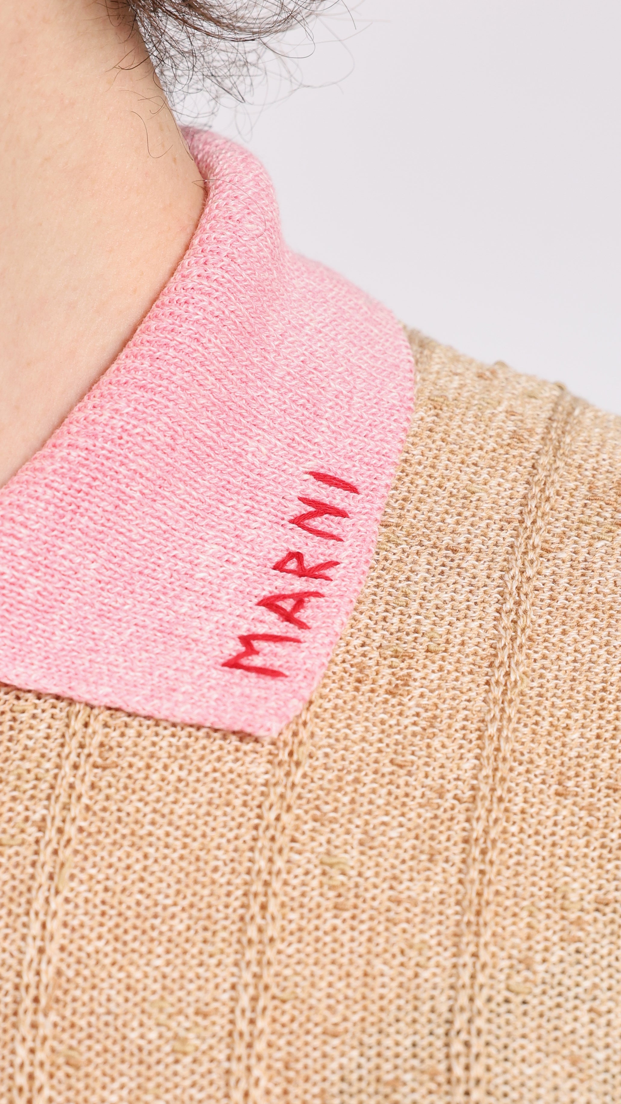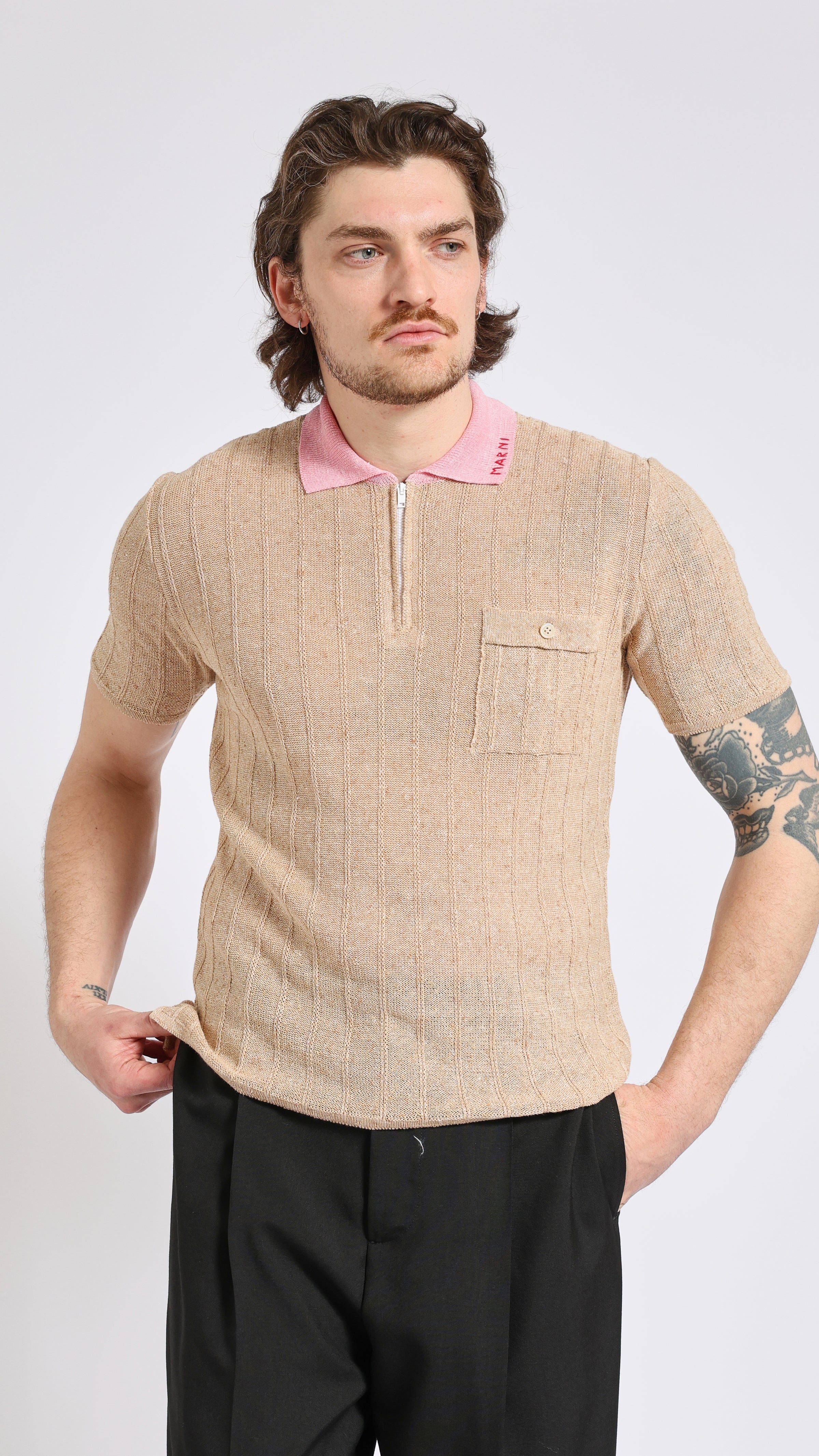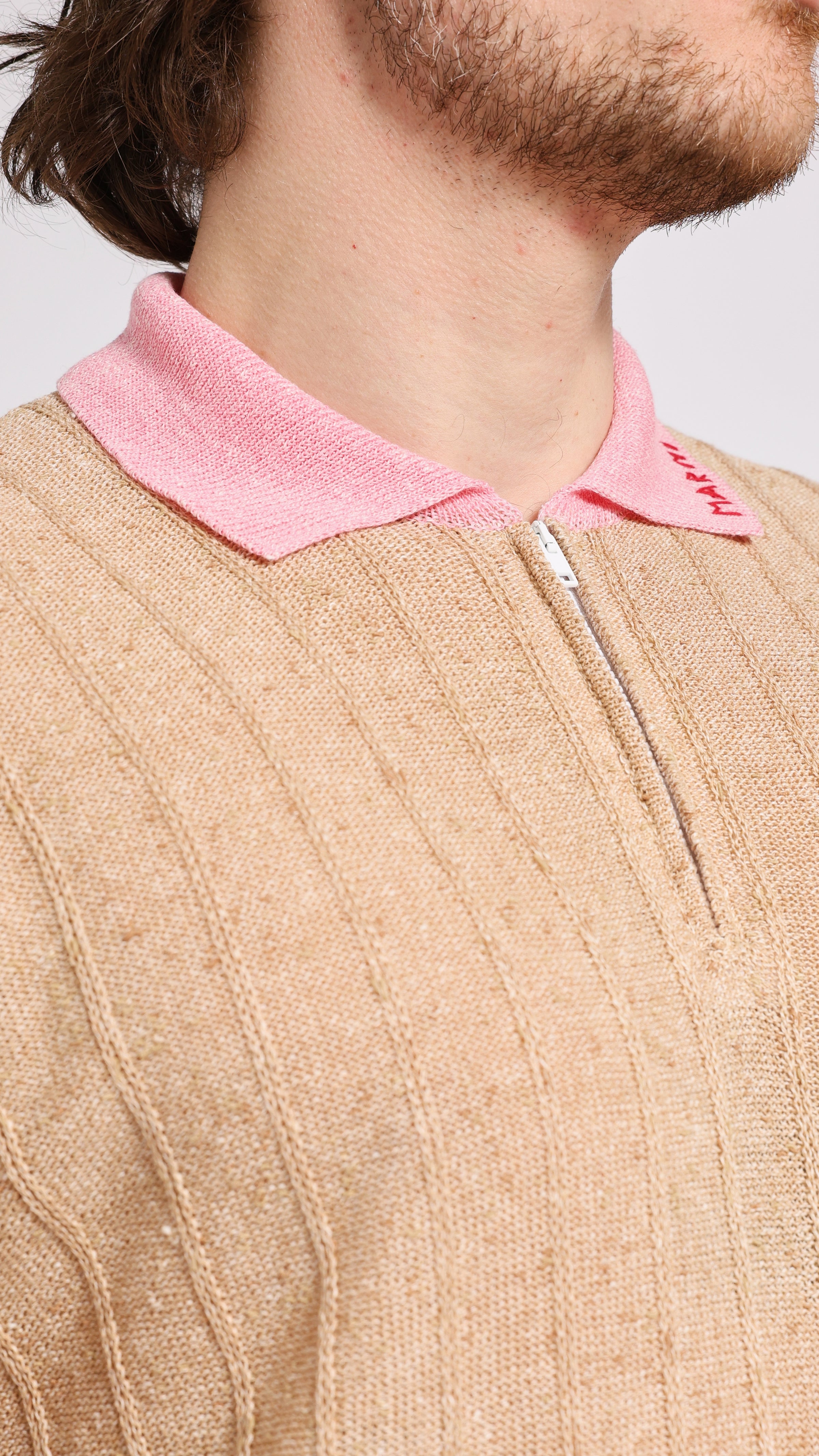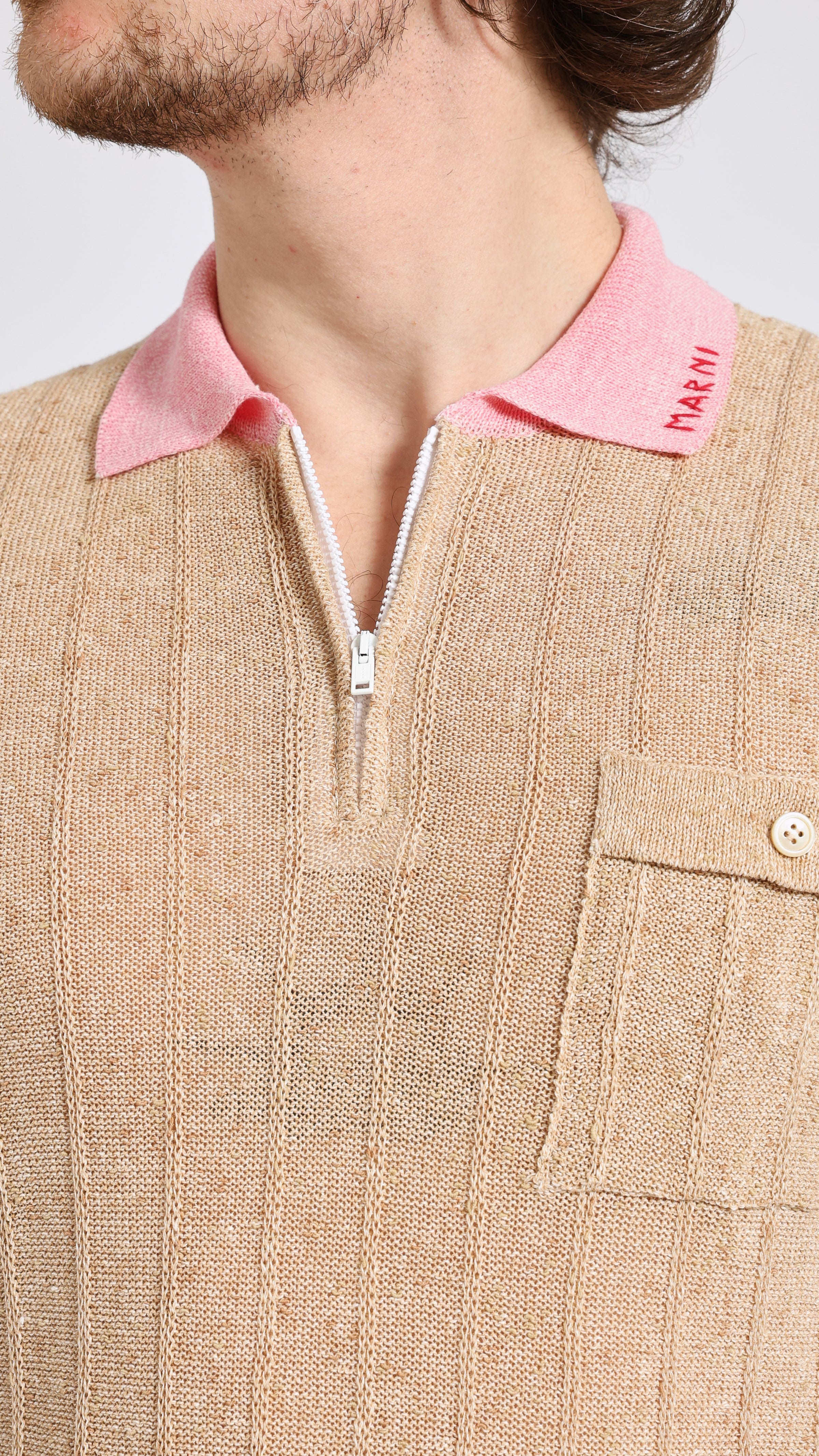Knit polo with contrast collar in beige. Slim fit. Zip neckline. Contrast collar in pink. MARNI embroidered logo on collar. Single buttoned chest pocket. Textured fabric.