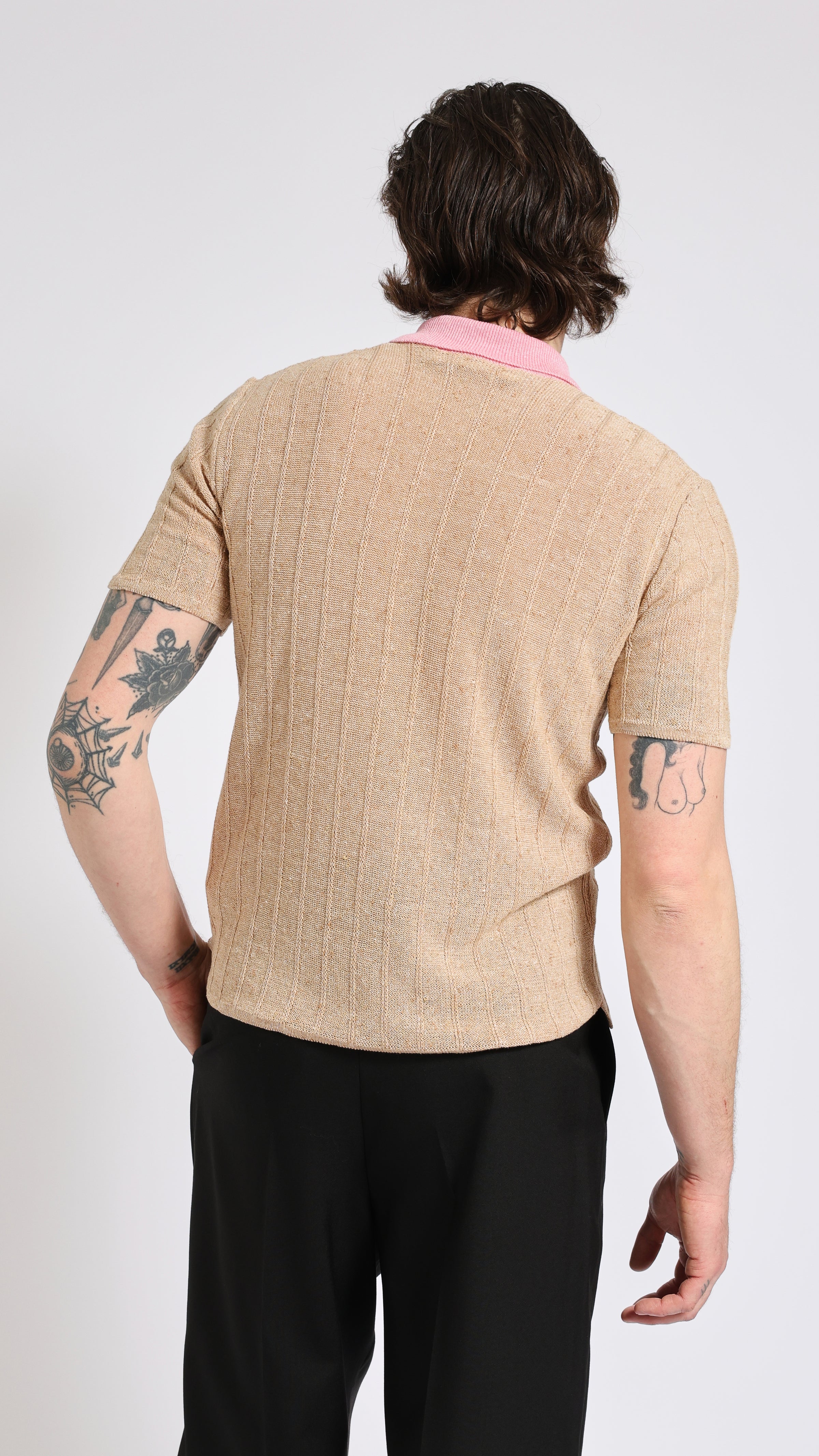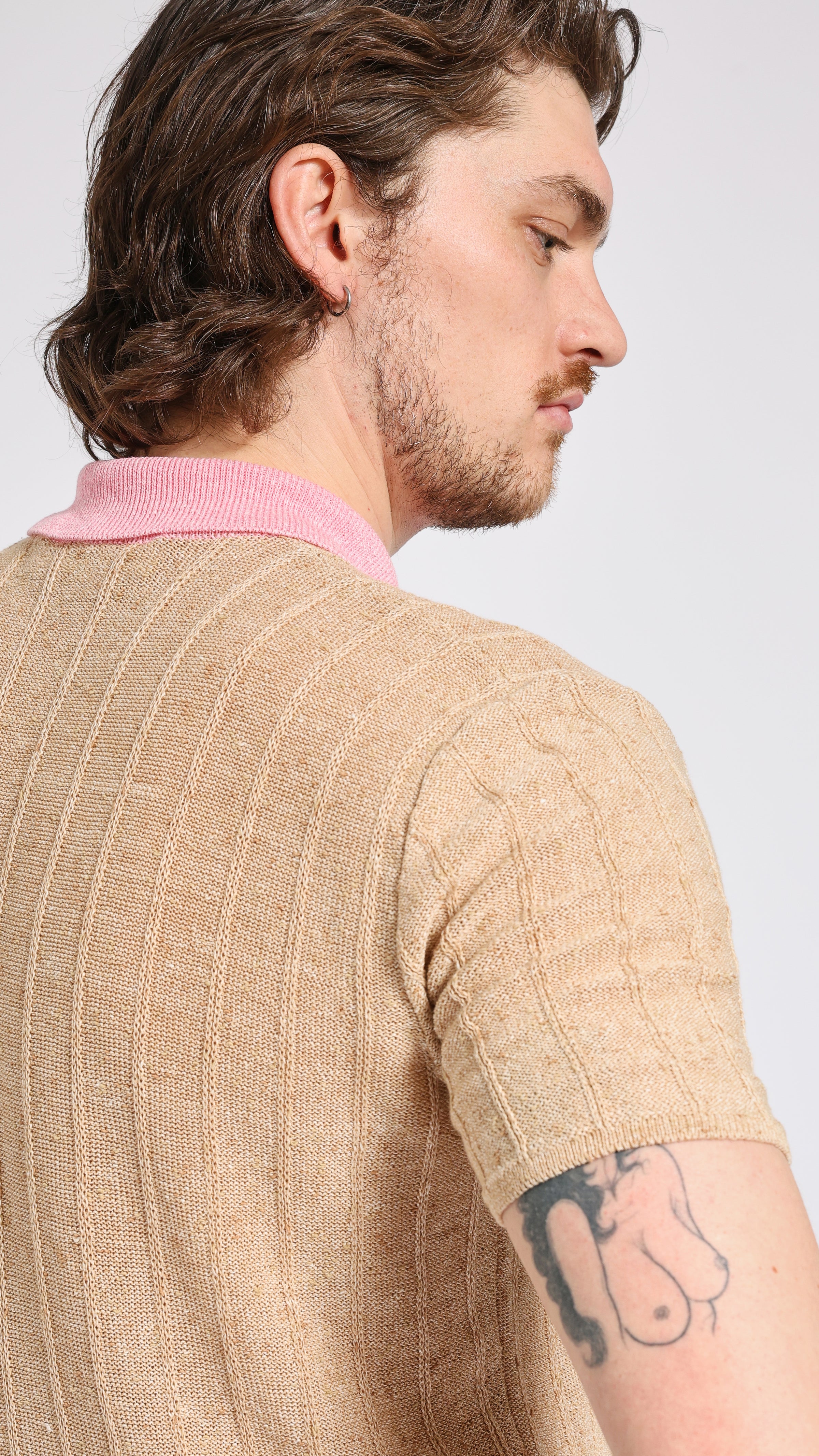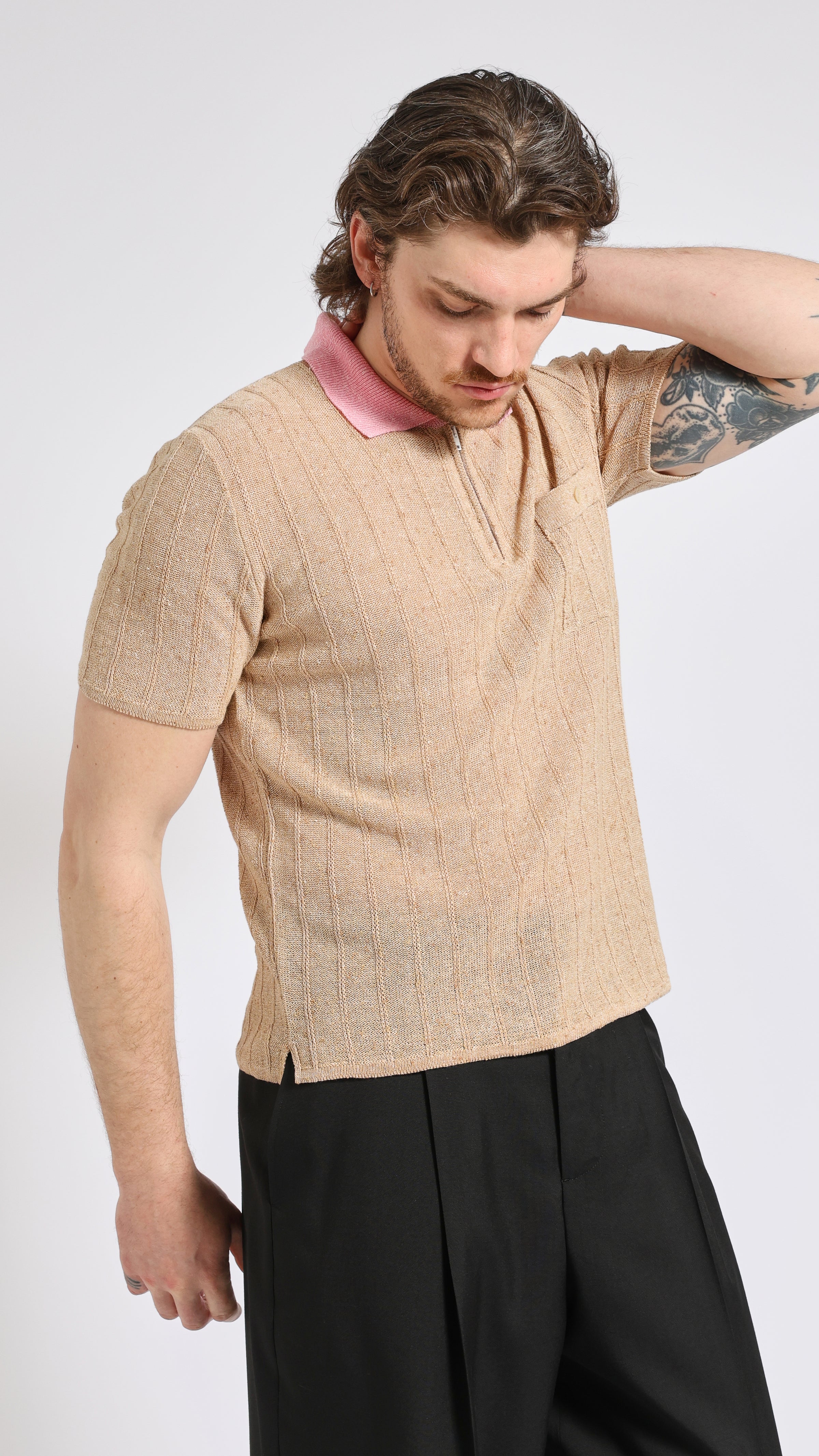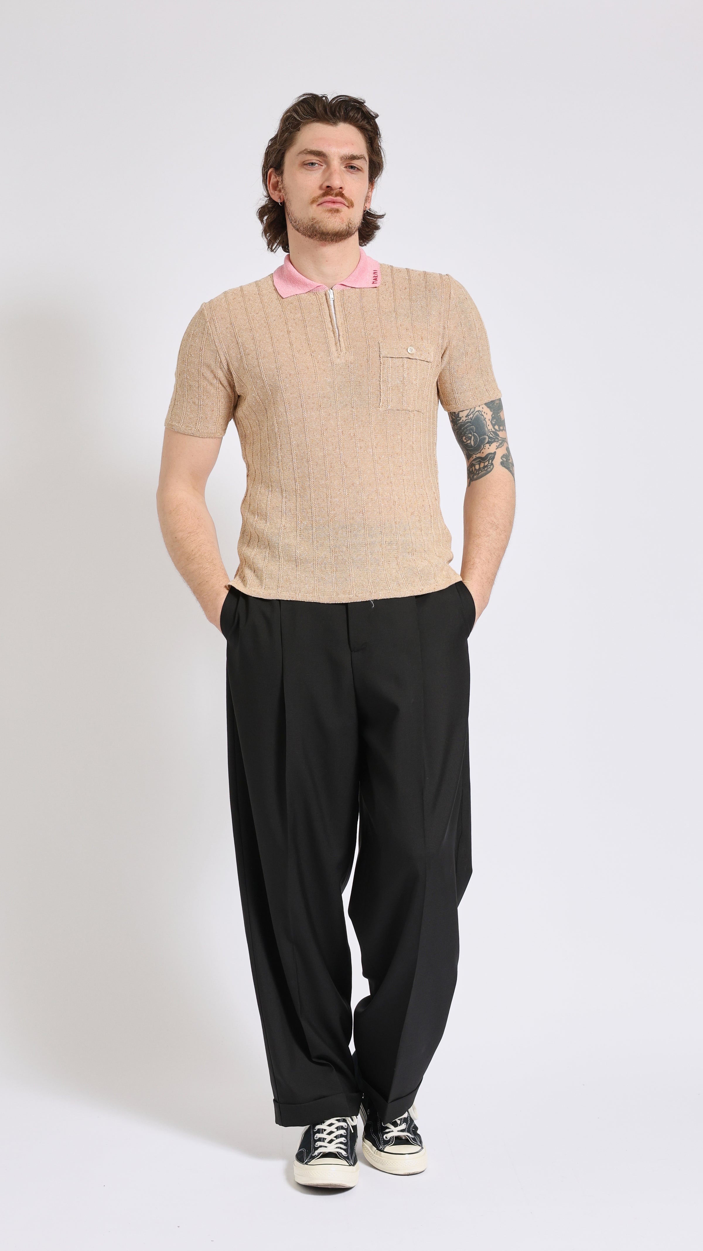 Knit polo with contrast collar in beige. Slim fit. Zip neckline. Contrast collar in pink. MARNI embroidered logo on collar. Single buttoned chest pocket. Textured fabric.