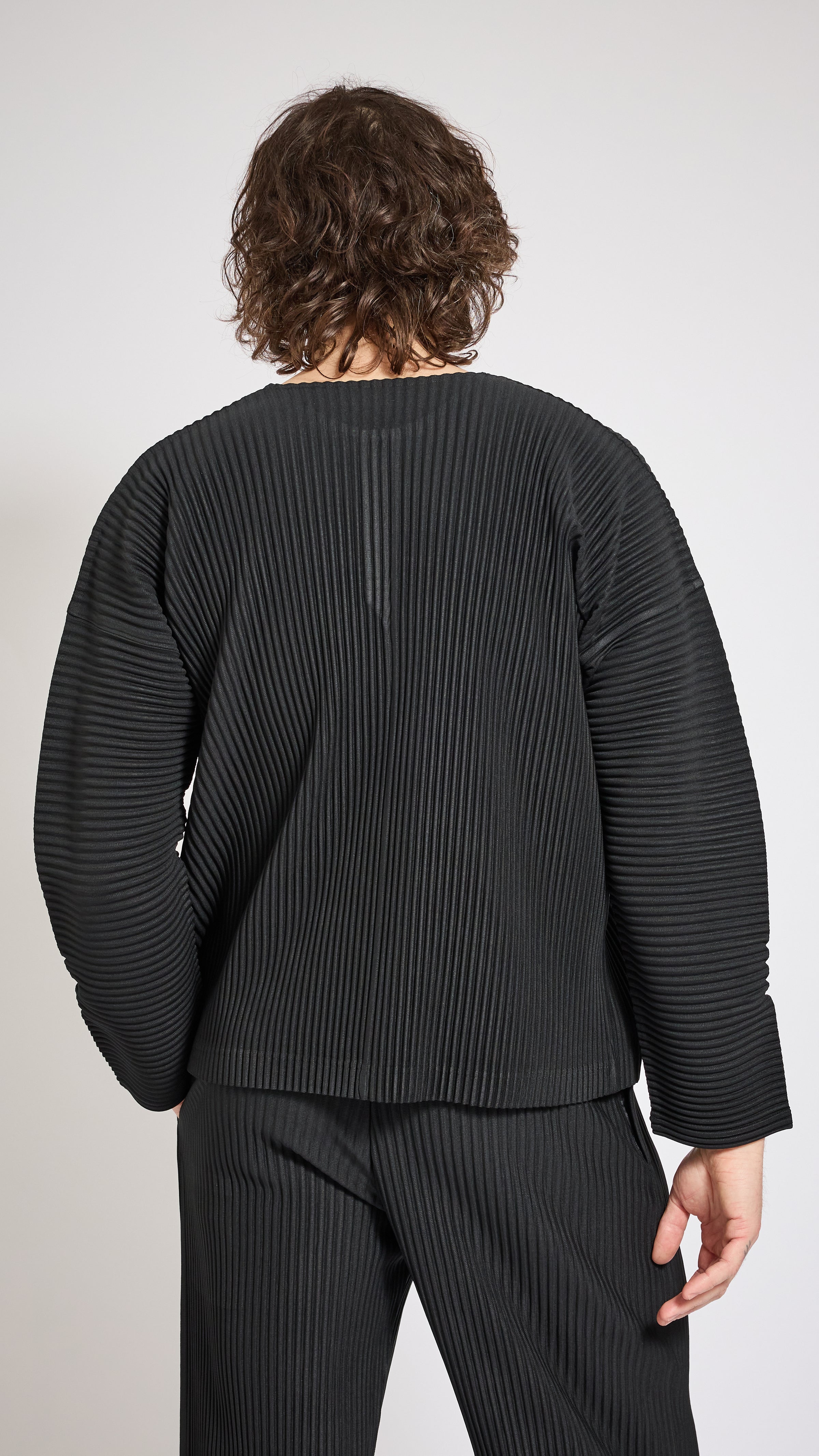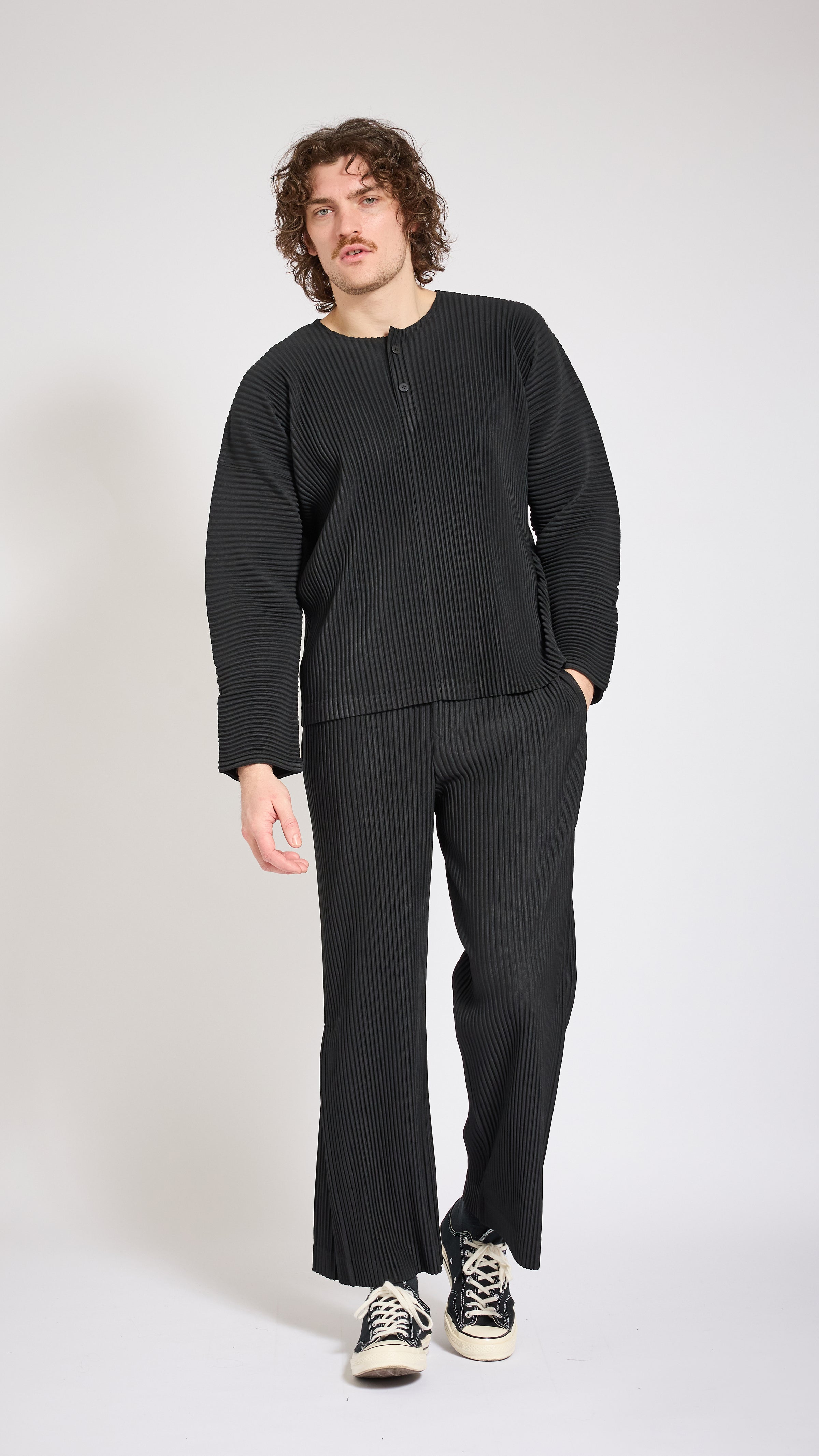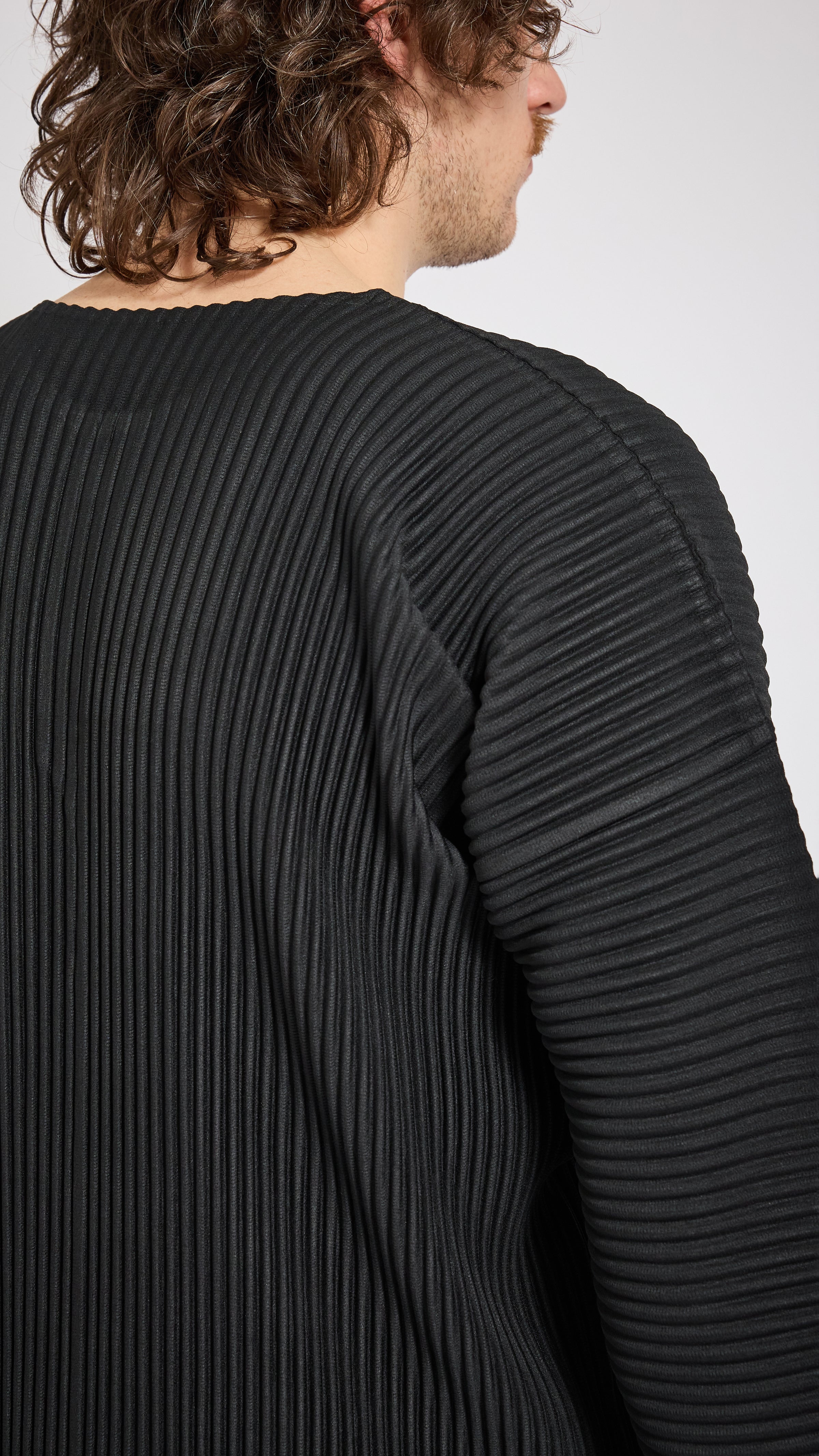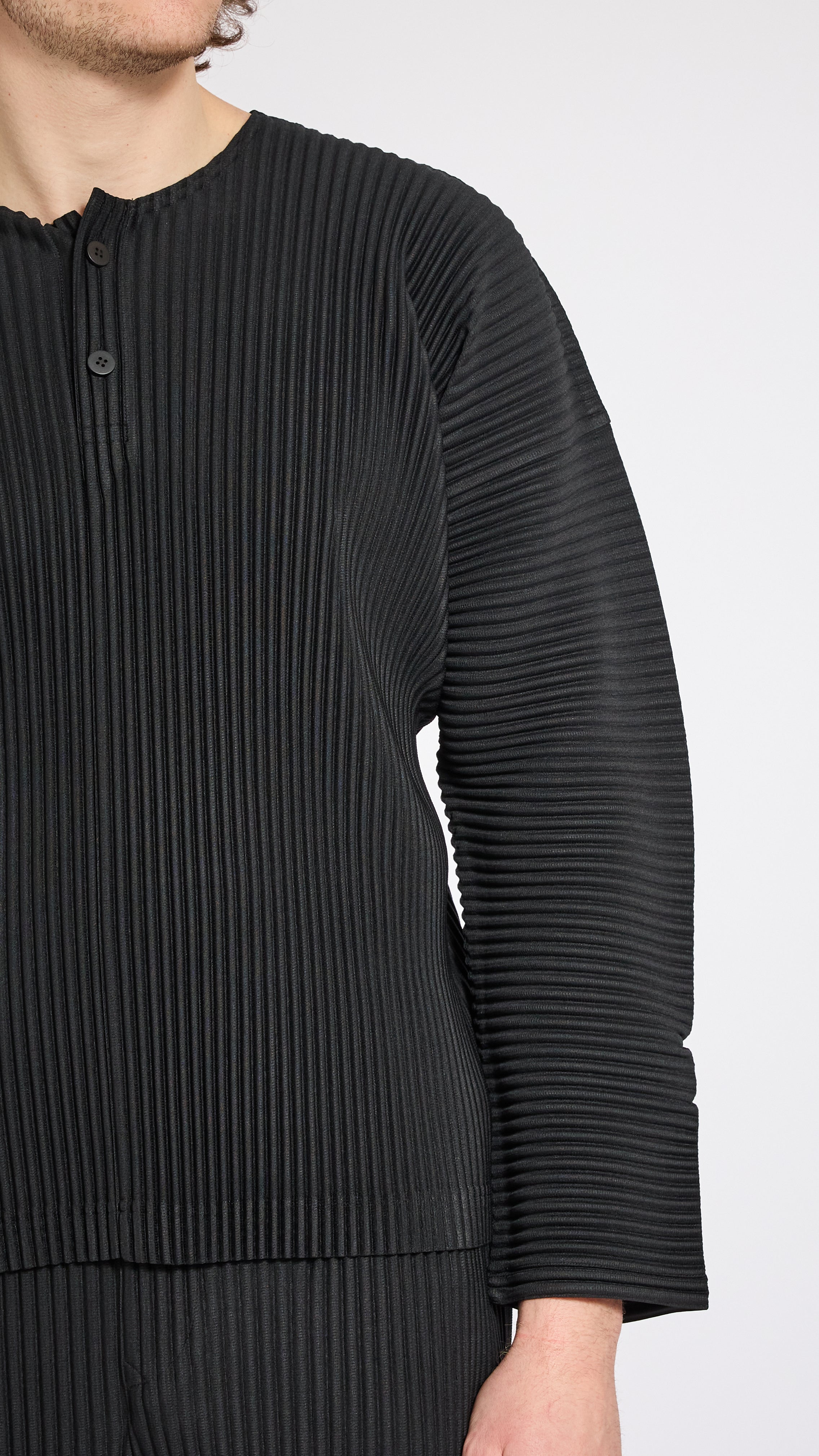 Pleated fabric long sleeve t-shirt in black. Regular fit. 3 button collar.