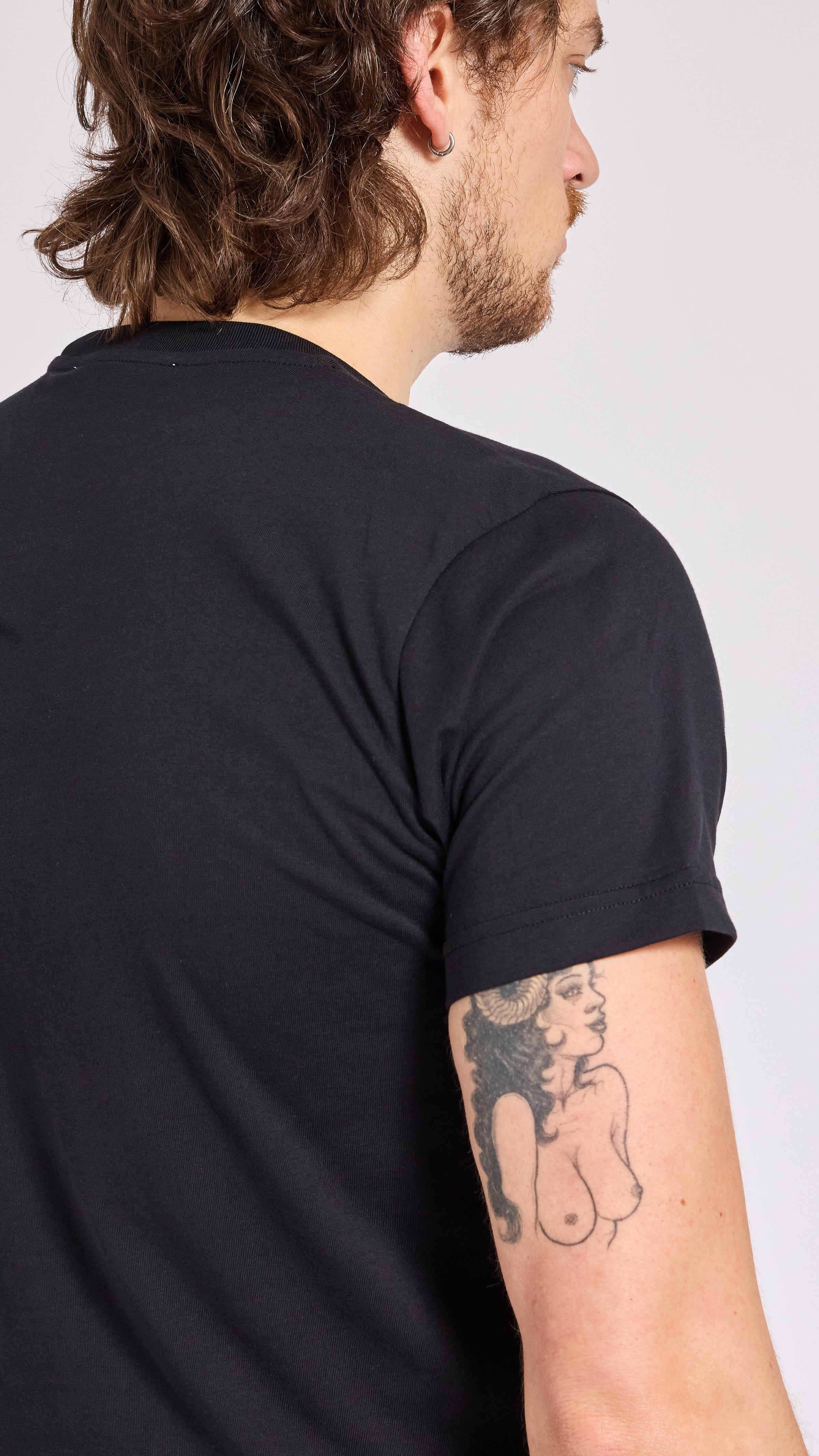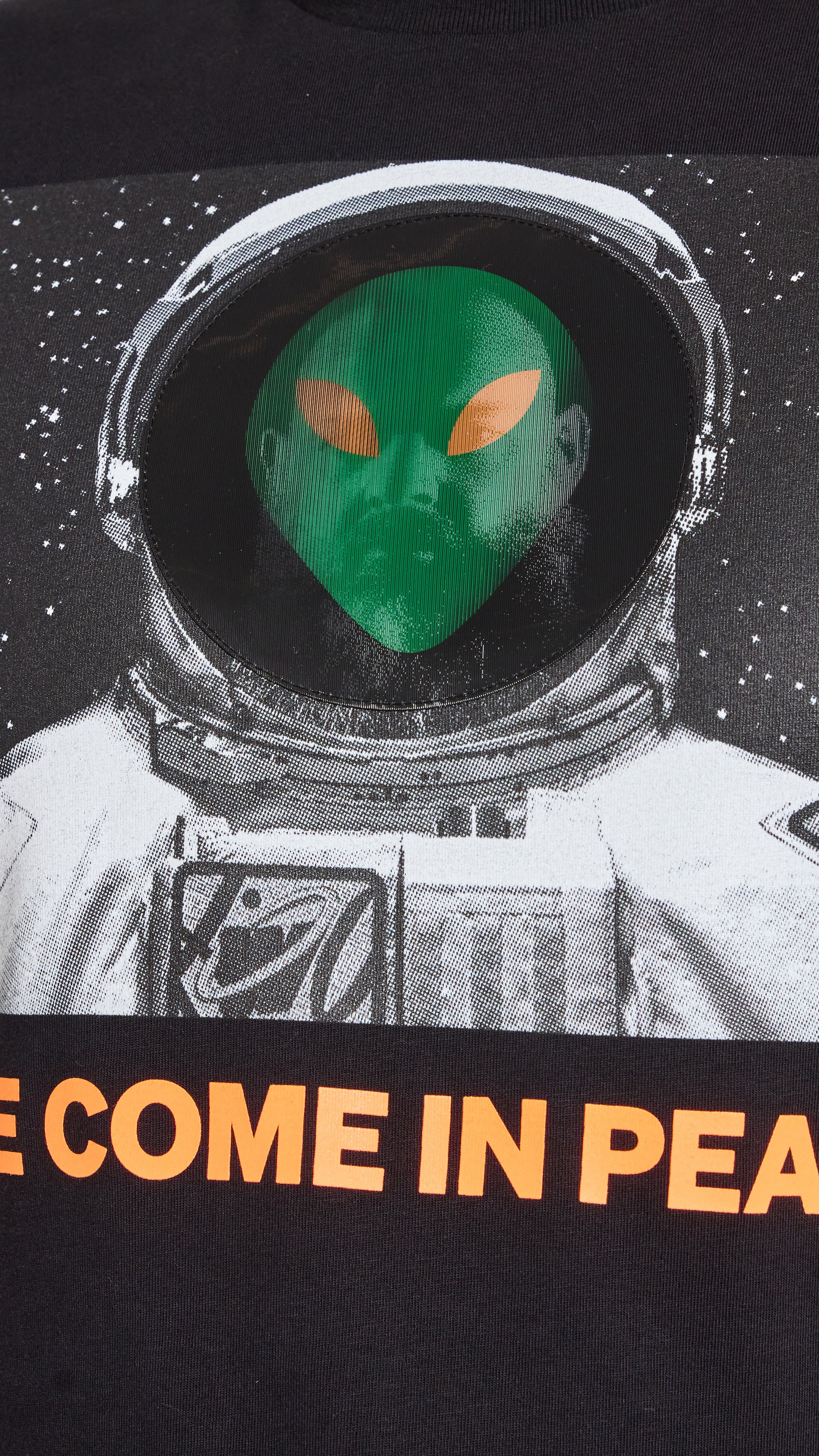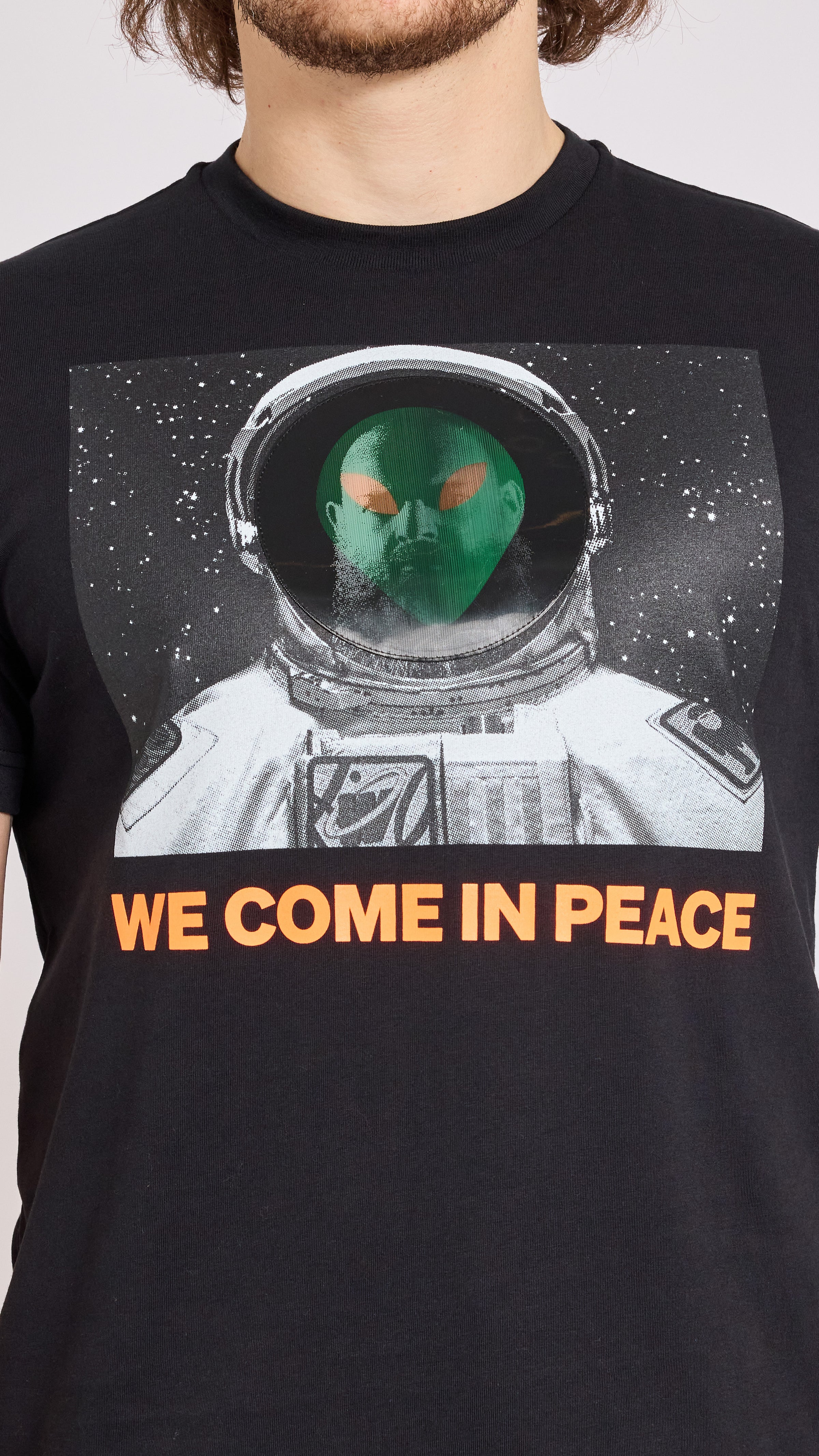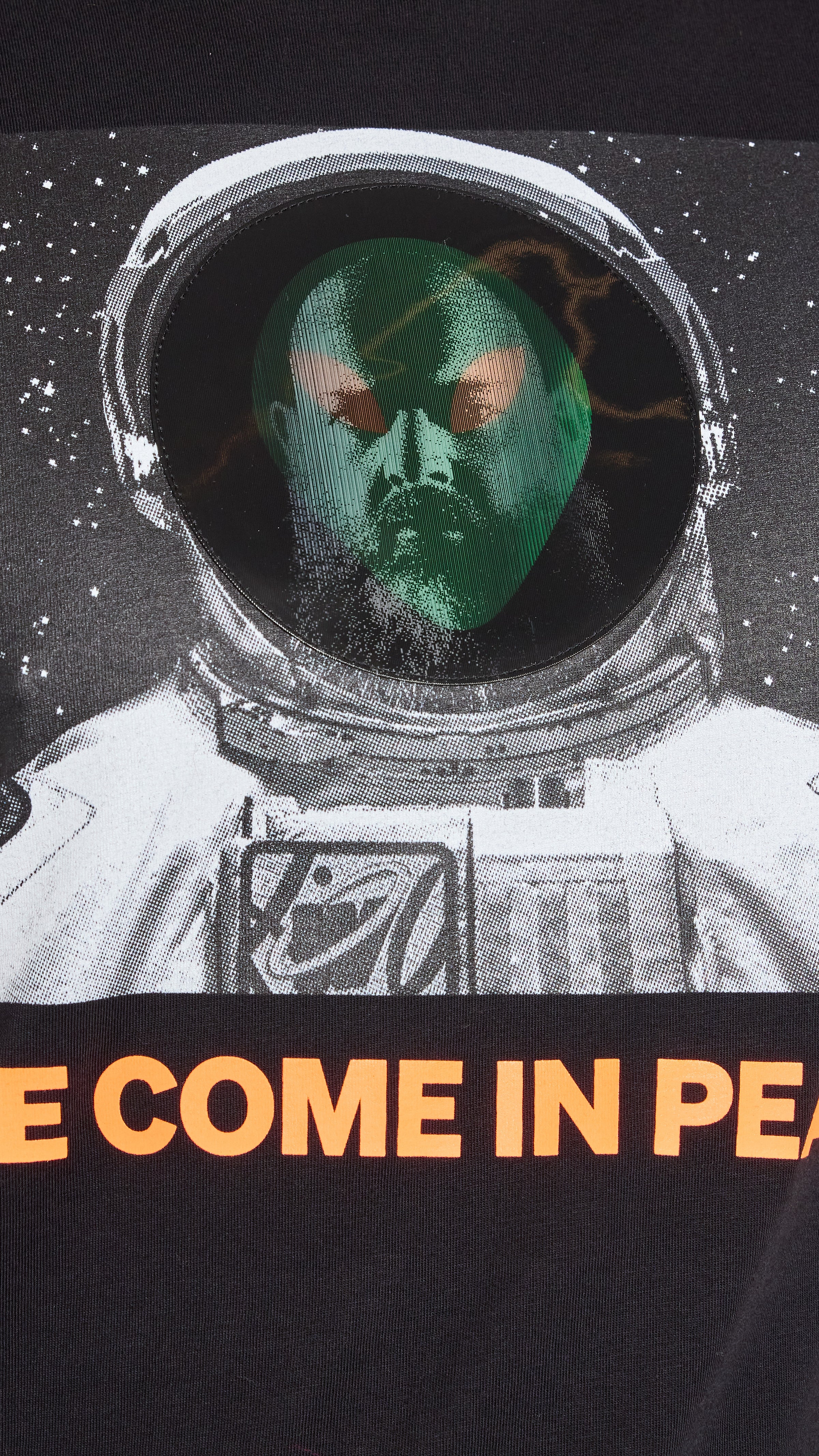 Classic style graphic t-shirt in black. Slim fit. Features hologram graphic on front with "We Come in Peace" slogan.  Ribbed knit collar.
