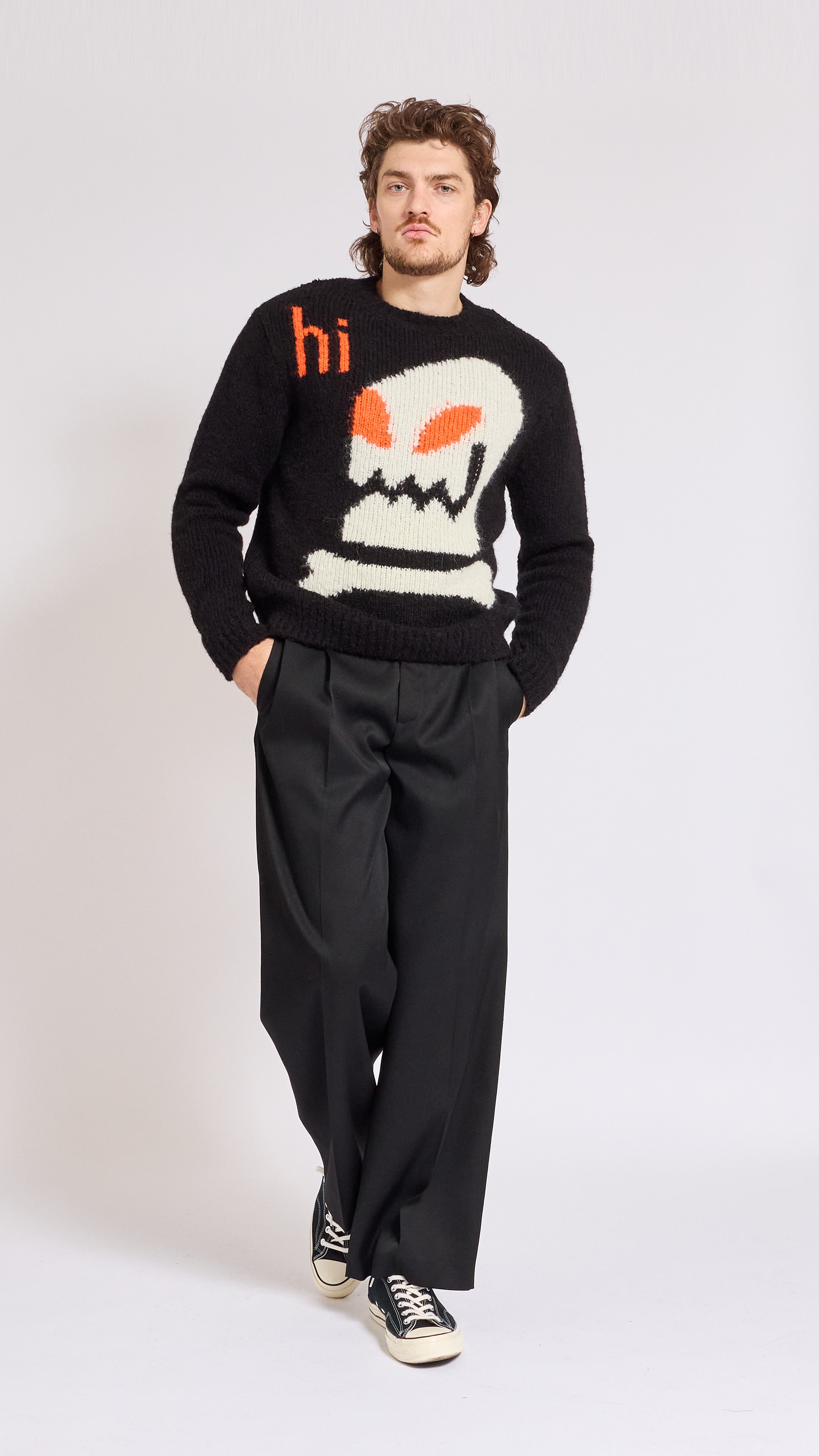 Classic style wool pants in black. Straight fit wider leg style. Two sides pockets and single back pockets. Single pleat. Belt loops. Mid-weight wool.