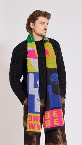 Wool scarf with graphics in black. Graphic "Walter I love" and "We come in Peace"